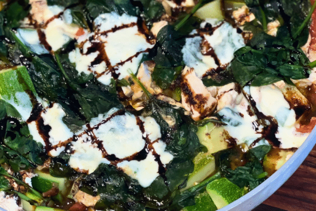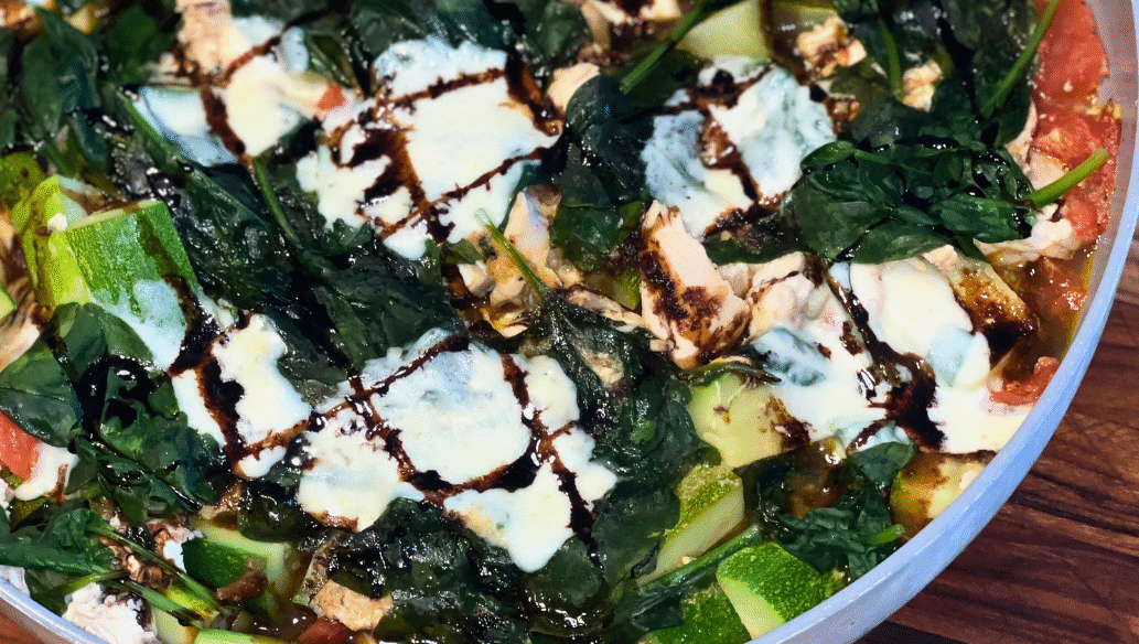 - When the zucchini is tender, add a layer of baby spinach to the pan, stirring it in until it begins to wilt.